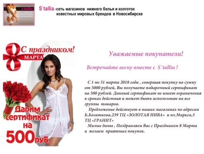 Сеть магазинов нижнего белья S'tallia поздравляет с 8 марта и дарит сертификат !!!